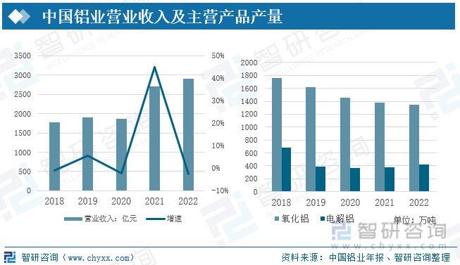 中國鋁業(yè)集團(tuán)有限公司是中國鋁行業(yè)中唯一集鋁土礦勘探、開采,氧化鋁、原鋁和鋁加工生產(chǎn)、銷售,技術(shù)研發(fā)為一體的大型鋁生產(chǎn)經(jīng)營企業(yè),是中國最大的氧化鋁、原鋁和鋁加工材生產(chǎn)商,是全球第二大氧化鋁生產(chǎn)商、第三大原鋁生產(chǎn)商。2021年,受鋁價格上升的影響,中國鋁業(yè)營業(yè)收入實現(xiàn)大幅增長,2021年營業(yè)收入為2988億元,較上年同期同比增加60.65%,2022年中國鋁業(yè)營業(yè)收入為2909億元,較上年減少80億元,同比減少2.64%。受鋁價格上升的影響,近年來中國鋁業(yè)主營產(chǎn)品氧化鋁與電解鋁的產(chǎn)量都呈現(xiàn)出下降的趨勢,2022年氧化鋁的生產(chǎn)產(chǎn)量為1351萬噸,較上年減少30萬噸,電解鋁產(chǎn)量略有增加電解鋁產(chǎn)量為417萬噸,較上年同期同比增加10.03%。