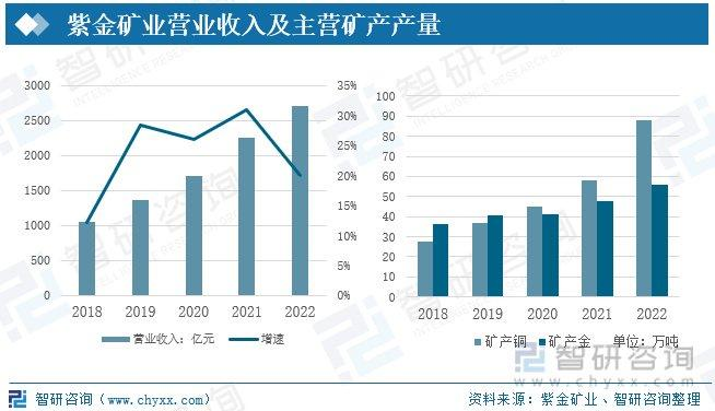 紫金礦業(yè)是一家在全球范圍內(nèi)從事銅、金、鋅、鋰等金屬礦產(chǎn)資源勘查、開發(fā)及工程設(shè)計、技術(shù)應(yīng)用研究的大型跨國礦業(yè)集團(tuán),是中國控制金屬礦產(chǎn)資源最多的企業(yè)之一。紫金礦業(yè)營業(yè)收入近年來保持高速增長的趨勢,2022年紫金礦業(yè)營業(yè)收入為2703億元,較2021年增加20%。2019年之前,紫金礦業(yè)礦產(chǎn)金的產(chǎn)量大于礦產(chǎn)銅的產(chǎn)量,2020年開始,紫金礦業(yè)開始大力發(fā)展礦產(chǎn)銅,礦產(chǎn)銅的產(chǎn)量實現(xiàn)高速增長,2022年,礦產(chǎn)銅的產(chǎn)量為88萬噸,較2021年增加30萬噸,同比增加51.72%。