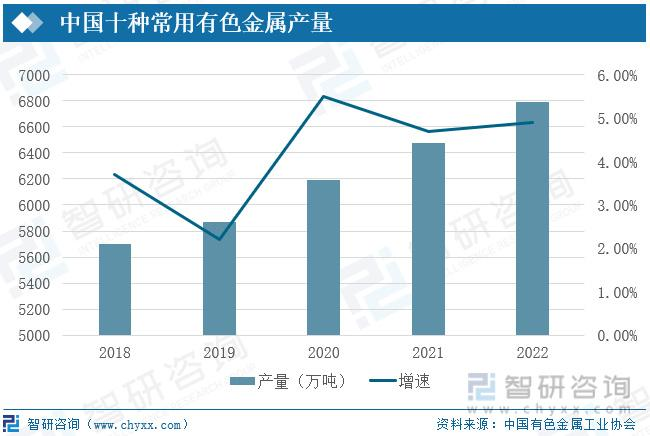 據(jù)中國有色金屬工業(yè)協(xié)會發(fā)布的數(shù)據(jù)統(tǒng)計,受下端需求拉動及消費量增加的影響,我國十種常見有色金屬的產(chǎn)量呈現(xiàn)逐年增加的趨勢,且增速較高。2022年十種常用有色金屬產(chǎn)量為6793.6萬噸,較2021年同比增加4.90%。