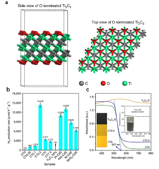 如上圖6所示,喬世璋課題組[4]通過(guò)DFT理論計(jì)算指導(dǎo)合成了一種具有高效共催化性能的MXene材料:Ti3C2納米顆粒。研究人員通過(guò)水熱法將Ti3C2納米顆粒集成到吸光材料CdS表面,實(shí)現(xiàn)了活性高達(dá)14342 μmol h-1 g-1的可見(jiàn)光催化產(chǎn)氫,且在420 nm處表觀量子效率為40.1%(圖6 b)。該研究成果首次將MXene作為共催化劑引入到光解水產(chǎn)氫體系中,證明了MXene在取代Pt,構(gòu)建低成本、高性能光電極或者光催化劑方面展現(xiàn)出來(lái)的巨大潛力。