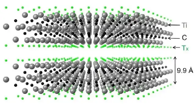 2011年,美國(guó)Drexel大學(xué)的Yury Gogotsi教授和Michel Barsoum教授[1]利用氫氟酸化學(xué)剝離三元層狀碳化物Ti3AlC2,成功制備出一種新型的二維碳化物晶體Ti3C2Tx(T代表-F和-OH等官能團(tuán))(圖1)。