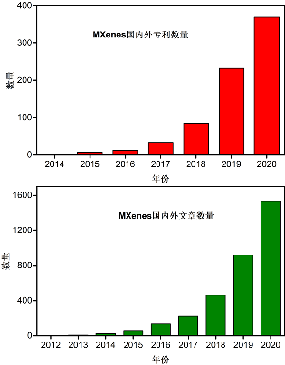 圖2 從“Web of Science”網(wǎng)站統(tǒng)計(jì)與MXenes相關(guān)的文章及國(guó)內(nèi)外專利數(shù)量