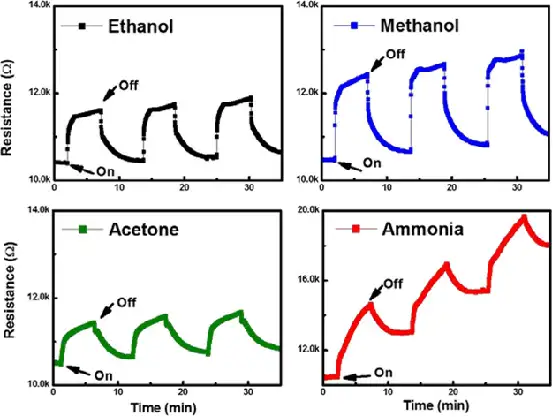 奧本大學(xué)Dong-Joo Kim教授[7]第一次報(bào)道了基于Ti3C2Tx的氣體傳感器,并籍此測(cè)試了乙醇、甲醇、丙酮和氨氣。作者將合成的Ti3C2Tx納米薄片用易操作的溶液澆鑄法制備在柔性聚酰亞胺薄膜上,并對(duì)其表面化學(xué)性質(zhì)進(jìn)行了研究。如圖9所示,Ti3C2Tx傳感器在室溫下成功地檢測(cè)了乙醇、甲醇、丙酮、氨氣等氣體,表現(xiàn)出p型傳感行為。由于Ti3C2Tx傳感器具有較大的吸收能量,因此對(duì)氨氣有較高的傳感響應(yīng)。根據(jù)傳感材料與傳感材料之間的相互作用產(chǎn)生的多數(shù)電荷載流子轉(zhuǎn)移,提出了該傳感器可能的傳感機(jī)理。這種新型的Ti3C2Tx氣體傳感器將是未來(lái)可穿戴電子設(shè)備的新一代通用傳感器,其性能可與其他2D材料傳感器相媲美,這也為MXenes材料在傳感器方面的應(yīng)用提供了一個(gè)新的方向。