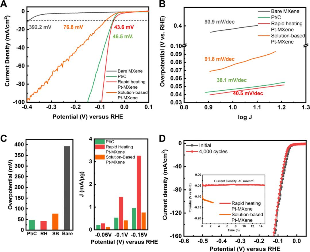 圖3 展示了快速加熱Pt-MXene作為電催化劑在HER中的性能??焖偌訜酨t-MXene表現(xiàn)出低過電位和高催化活性,與商業(yè)Pt/C相比具有更高的質(zhì)量活性和更低的Tafel斜率。這歸因于Pt納米顆粒的均勻分布和MXene表面在合成過程中的保護(hù),從而最大化了催化活性位點(diǎn)的暴露。此外,快速加熱Pt-MXene在長期穩(wěn)定性測試中顯示出優(yōu)異的穩(wěn)定性,遠(yuǎn)超過溶液處理的Pt-MXene。