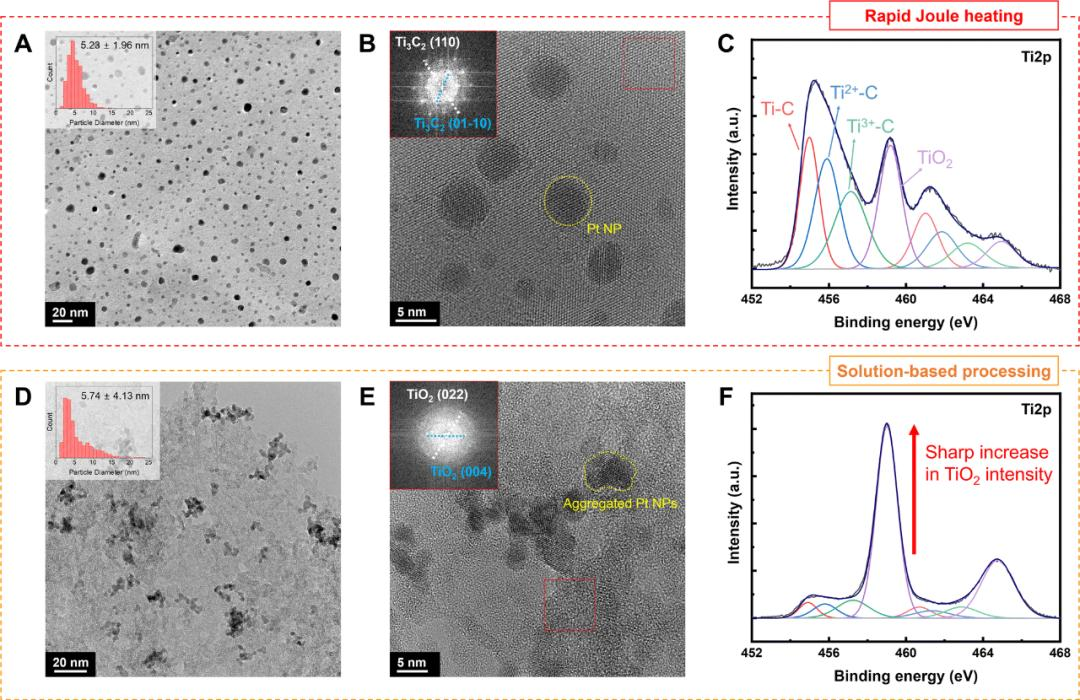 圖2 比較了快速加熱和傳統(tǒng)溶液處理方法制備的Pt-Ti3C2Tx MXene復(fù)合納米結(jié)構(gòu)的表面結(jié)構(gòu)和形貌。快速加熱法制備的Pt納米顆粒表現(xiàn)出高度均勻分散,而溶液處理法則導(dǎo)致Pt納米顆粒在MXene表面嚴(yán)重聚集。此外,快速加熱法顯著減少了MXene的氧化,而溶液處理法則導(dǎo)致MXene氧化成TiO2。XPS和XRD分析進(jìn)一步證實(shí)了快速加熱法在合成過程中對(duì)MXene的保護(hù)作用,減少了氧化。
