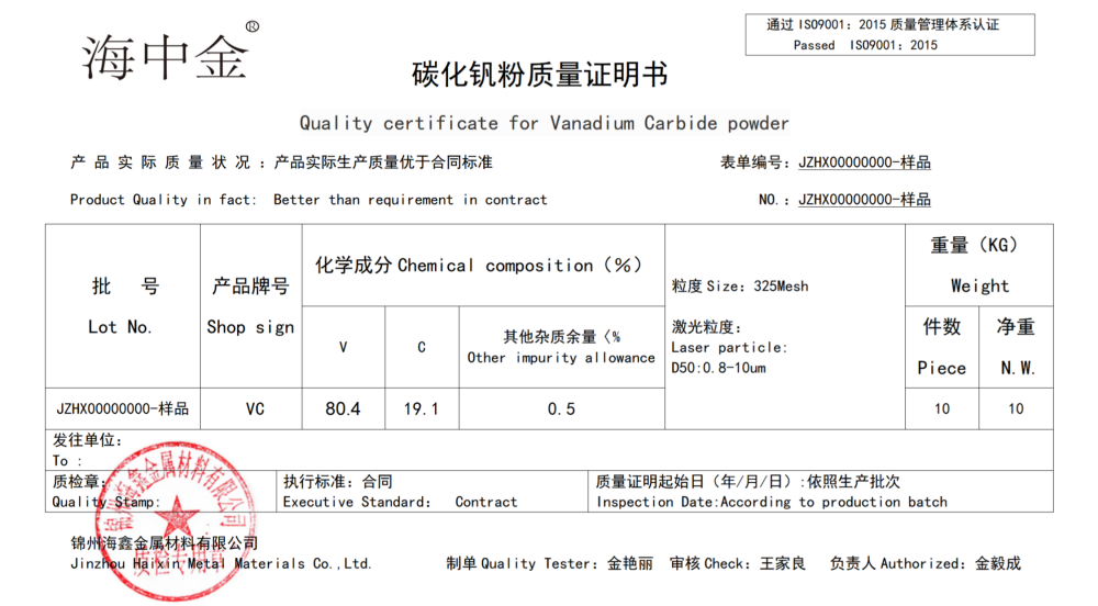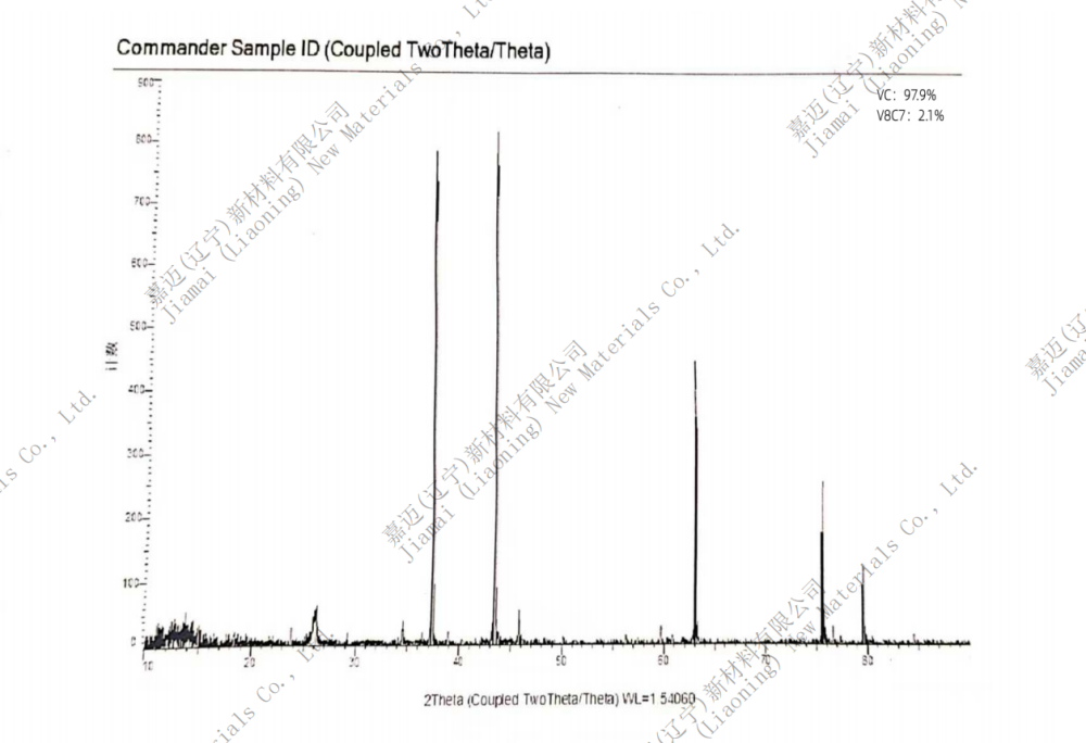 3.高硬度:碳化釩具有極高的硬度,在Mohs硬度測試中可以達(dá)到9.0級(jí)以上,比鋼鐵、鋁等常見金屬硬度高出很多。